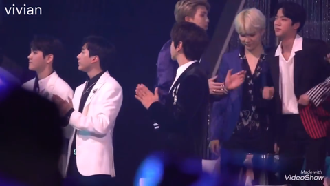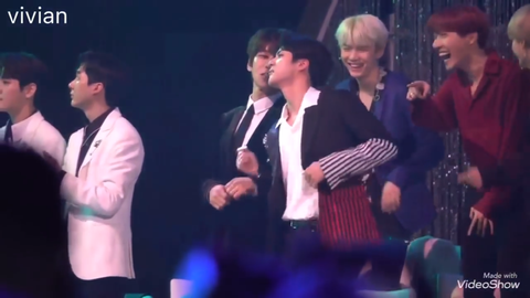And here, the Bangtan members came back after changing their stage outfit. Meanwhile Jinㅋㅋㅋㅋ he was dancing excitedly while coming back and Jimin (? I'm not sure) who was in front of him saw Jin and started dancing tooㅋㅋ