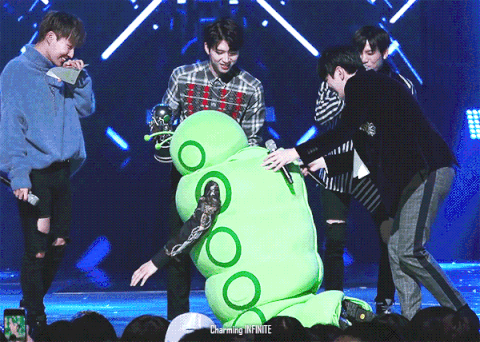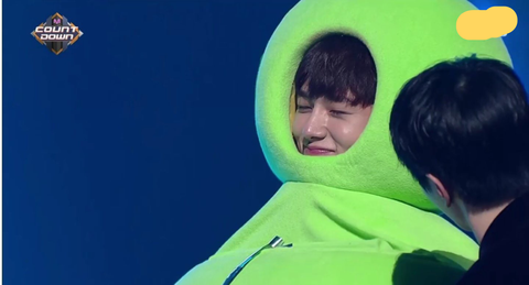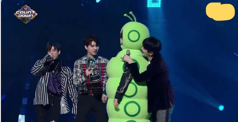 and today, they won #1 on Mcountdown, so L appeared in a caterpillar outfit for their encore stage
