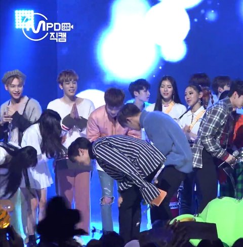 (the one wearing the white and black stripe shirt and bowing 90 degrees is Dongwoo)