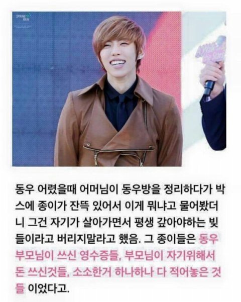 - "There was an interview where his mom said that she found a box in Dongwoo's room while doing spring cleaning. She was about to throw it away but Dongwoo took it from her before she could do so. When she asked him why, he said that it contained the debt that he needed to repay for his whole life. His mom looked inside and there were receipts of stuff his parents bought him (since he was a child) and notes he wrote of the stuff they did for him (like loving him, feeding him etc.). He told her that his life won't be complete until he can repay his debt back to his parents."