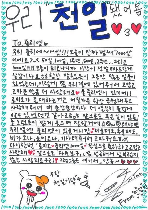 - "Juliet~ Wow it's already our 1000 days today>< 50 days, 100 days, 1 year, 500 days, 2 years... And 1000 days TT TT It's today, I realized how fast time passed byㅎㅎ A lot of things that happened, but I want to thank you for being beside us for all this time, I'm thankful and I love you <3 Our Juliets are all there! No matter what Romeo does and no matter where we go, I feel like we'll be able to enjoy ourselves and work hard because you're always supporting us and giving us love ㅎㅁㅎ No matter what happens from now! I will always smile brightly @w@ Because Juliets are by our sides <3 <3 When it gets hot, when it gets cold, when it rains, when it snows, thank you guys for waiting for us TT^TT Once again! Romeo <3 Juliet's 1000th day<3 Congrats to us and thank you, we love you <3 <3 Let's see each other often from now on >< We'll succeed for sure and I'll become someone you're not ashamed of <3 That's all for today....bye~ <3<3<3"