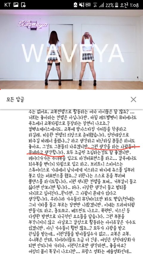 Basically they're saying how there agree with what he/she said but there are lots of female groups with the school uniform concept. They say that it's their own freedom to choose whatever they want to wear. And that people who actually find that this is an issues are actually the ones who are problematic. They then bring up Lady Gaga who's known for her extravagant costumes like that bandage costume she wore and Rihanna who does poll dancing. They basically tell them that if you don't like those and find it too sexy to not watch them. They then mention how music videos have changed since back in the days how now it's just like a drama you see bed scenes, kiss scenes, etc. There are singers like IU who are still very "conservative" but there are way more singers who don't follow this pattern anymore.