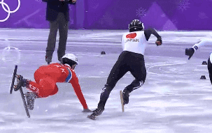 - First of all, this gif doesn’t show everything. 1. He pushed the Japanese athlete 2. As he was falling, he was floundering his arms around à it’s like he was overreacting on purpose to grab unto the Japanese athlete 3. During the second half he fell the same way and was floundering his arms again. How can people still be suspicious after all these actions? If he got surprised, he would have flounder his arms a bit and then put them back and skate forward. But seriously, to stretch out his arms like that for the whole time he was falling, it seriously doesn’t look like he was taken aback nor that this was done as a mistake. No matter what the circumstances between the two countries, they should still compete fairly. It’s not that he was so young, that he has no experience and that this was his first time doing short track either. He played dirty and even put the other athlete in a dangerous situation. He deserves the criticism. If the Japanese athlete fell, he could have endangered other players too…