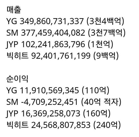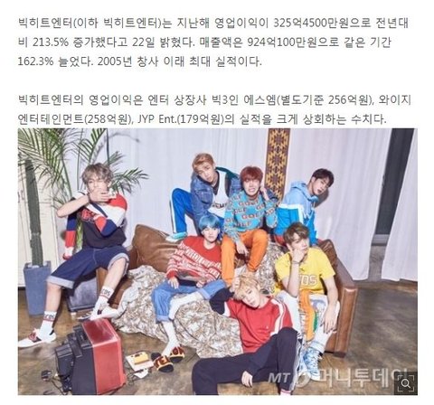 basically saying how Bighit registered their highest sales last year while doubling their sales with 213.5% margin. Their recorded sales was 92.4M exceeding those of SM (25.6M), YG (25.8M) and JYP (17.9M).