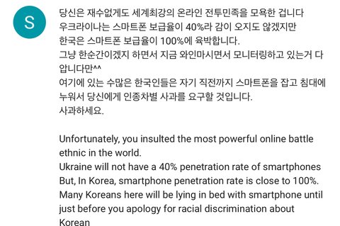 - "You know that China holds a festival to enjoy dog food every June? They would slaughter 1000 dogs and sell them. For China to hold a dog meat festival shows you how popular of a product dog meat is over there, why don't you hold any opinion towards China then? If you hate the dog meat culture, then why don't you target the largest consumer of dog food, which is China? You can't say anything because they're a powerful nation, you give me goosebumps. If you hate the dog meat industry, then why don't you attack the farms producing them instead? I can count on my fingers the number of people in Korea consuming dog meat because there are so few. You're such a loser for making fun of Korea when you know nothing about us. To be honest, you don't even do that because you love dogs. You just did it because you wanted to slander Korea and you found the best opportunity right? I'll remember who you are. A racist. The blood that ruins in you is probably clogged up because of the dirt in you. The way you suck your own kind reminds me of Japan. The ones who massacred the innocent Asians and committed all the war crimes during WWII were Japanese. Although you're white in your outer shell, the inside of you is Japanese. You deceive the innocent Koreans, and you just want to abuse us mentally. Apologize"