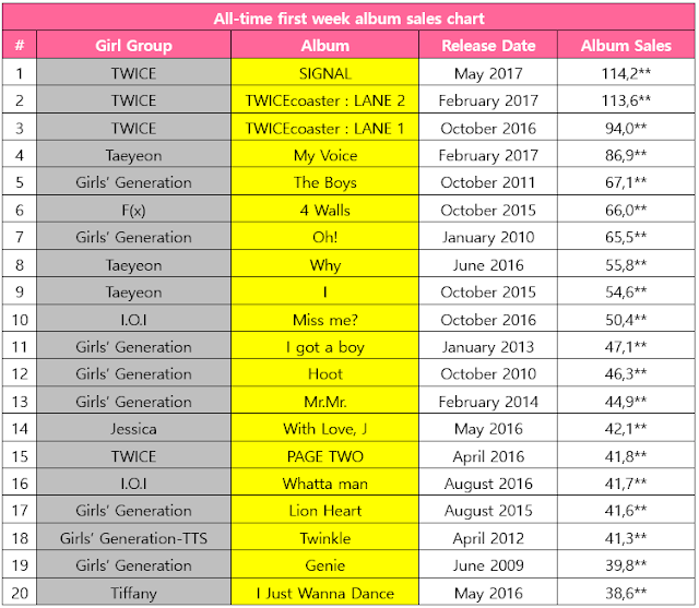 So, here's the all-time first week album sales chart for k-pop girl groups(so far). As you can see below, it is very notable that TWICE is very strong on the chart even through it has been only 2 years since the girl group debuted, while Girls' Generation, who's maintaining its position as the most popular and influential k-pop girl group is taking 13 of 20 spots of the top 20 of the chart.