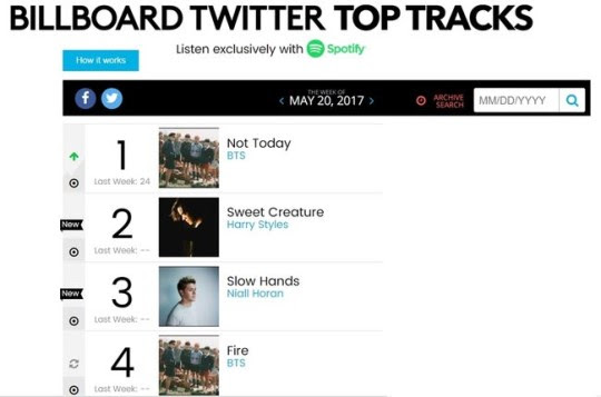 According to the latest Billboard Twitter Top Tracks chart, BTS' "Not Today" went up 23 steps to No.1, beating Harry Style's "Sweet Creature" and Niall Horan's "Slow Hands". It means "Not Today" is the most mentioned or shared song on Twitter this week, while it's notable that BTS' another song "Fire" also ranked in 4th place.