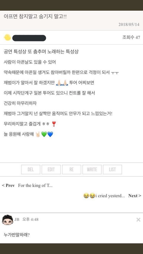There were people who were asking for a feedback to this, but JB usually treats his fans really closely like friends. Some fans even mentioned that JB went back to the fancafe and apologized because he didn't know and he was very careful with his comments.
