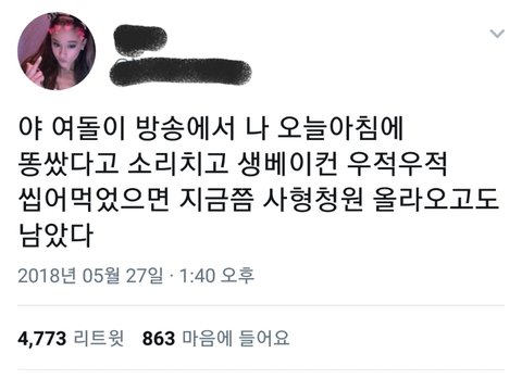 "Yah if a female idol said something like "I pooped this morning" on live broadcast and ate a raw bacon, you f*cking would've buried her alive and there would be death petitions over her now"