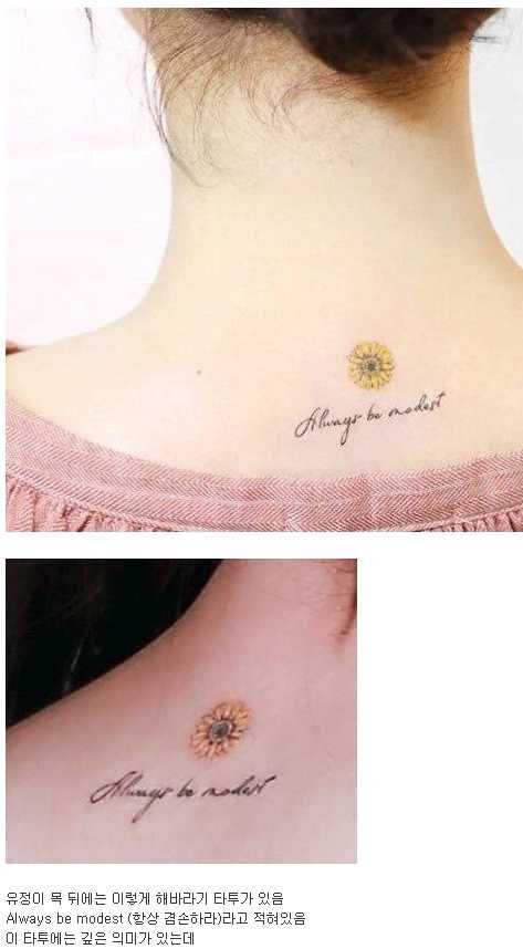 There's a sunflower tattoo behind Yoojung's neck with the message 'Always be modest'